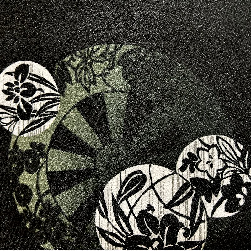 【色 柄】黒の縮緬生地にグリーンの車柄と花の丸紋柄。八掛けは暗い赤色。
