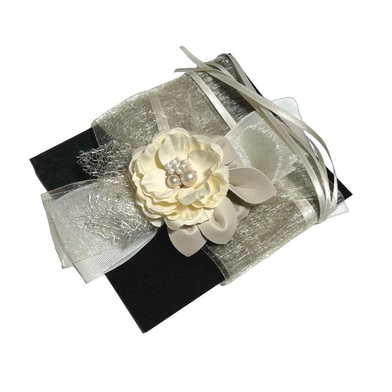 リボン部分はホワイトのリボンと少しイエロー系のオーガンジー、横にはキラキラ光る銀色のレースリボン。