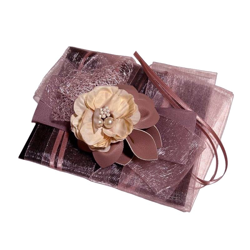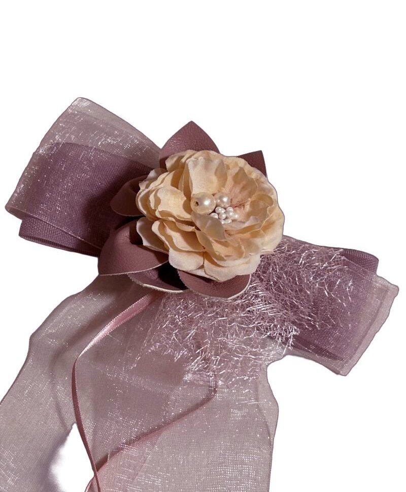 リボン部分はくすんだピンクのリボンと淡いピンクのオーガンジー、横にはキラキラ光るピンクのレースリボン。