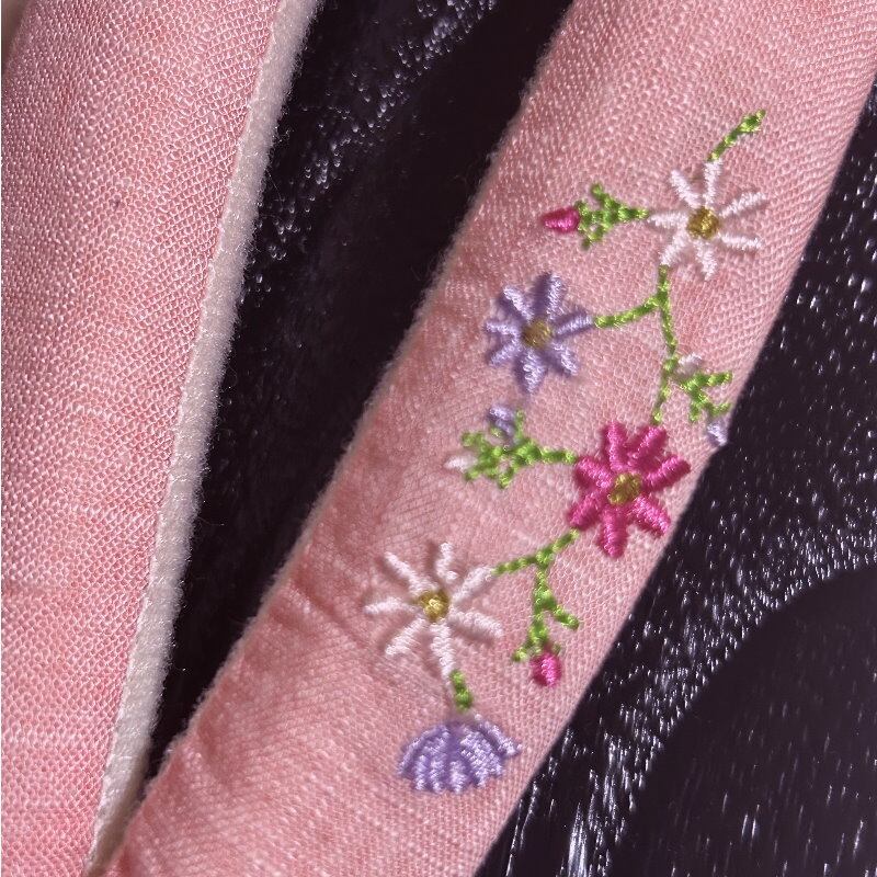 鼻緒は淡いピンク色にピンクやパープル系で花柄が刺繍されています。鼻緒の裏は白、ツボは紫色。