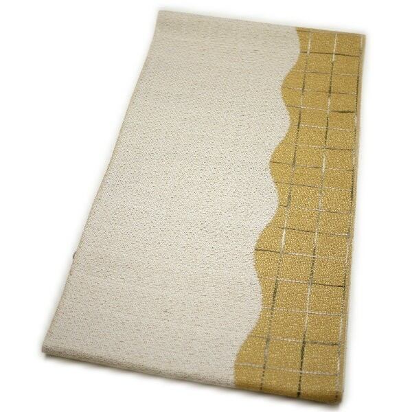 【色 柄】生成り色地に、波型に落ち着いた黄色が配色されています。市松模様の部分は、かなりふっくらとした凹凸になっています。