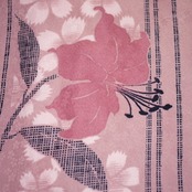 【色 柄】くすんだ薄ピンク地に桜柄の地模様の生地、ピンク系の百合と桜の花柄。八掛はサーモンピンク色。
