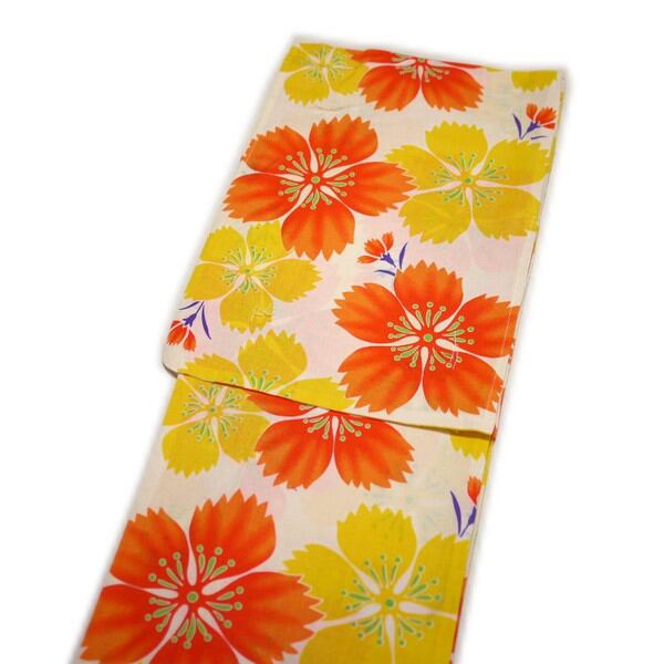 【色 柄】オフホワイト色地に綺麗なオレンジとイエローのナデシコ柄。