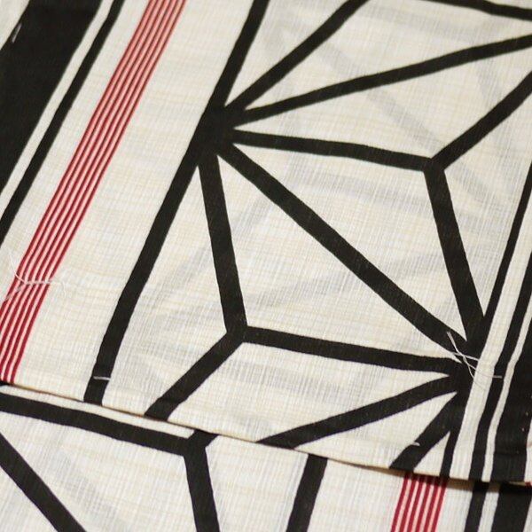 【色 柄】生成り色地に赤と黒の縞柄。大きな麻の葉柄が小粋な浴衣です。
