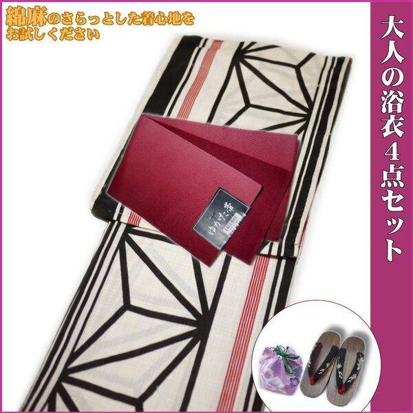 浴衣 レディース 4点 セット レトロ 粋 高級 綿麻 麻混(生成りに赤黒 麻の葉柄) [060593set]