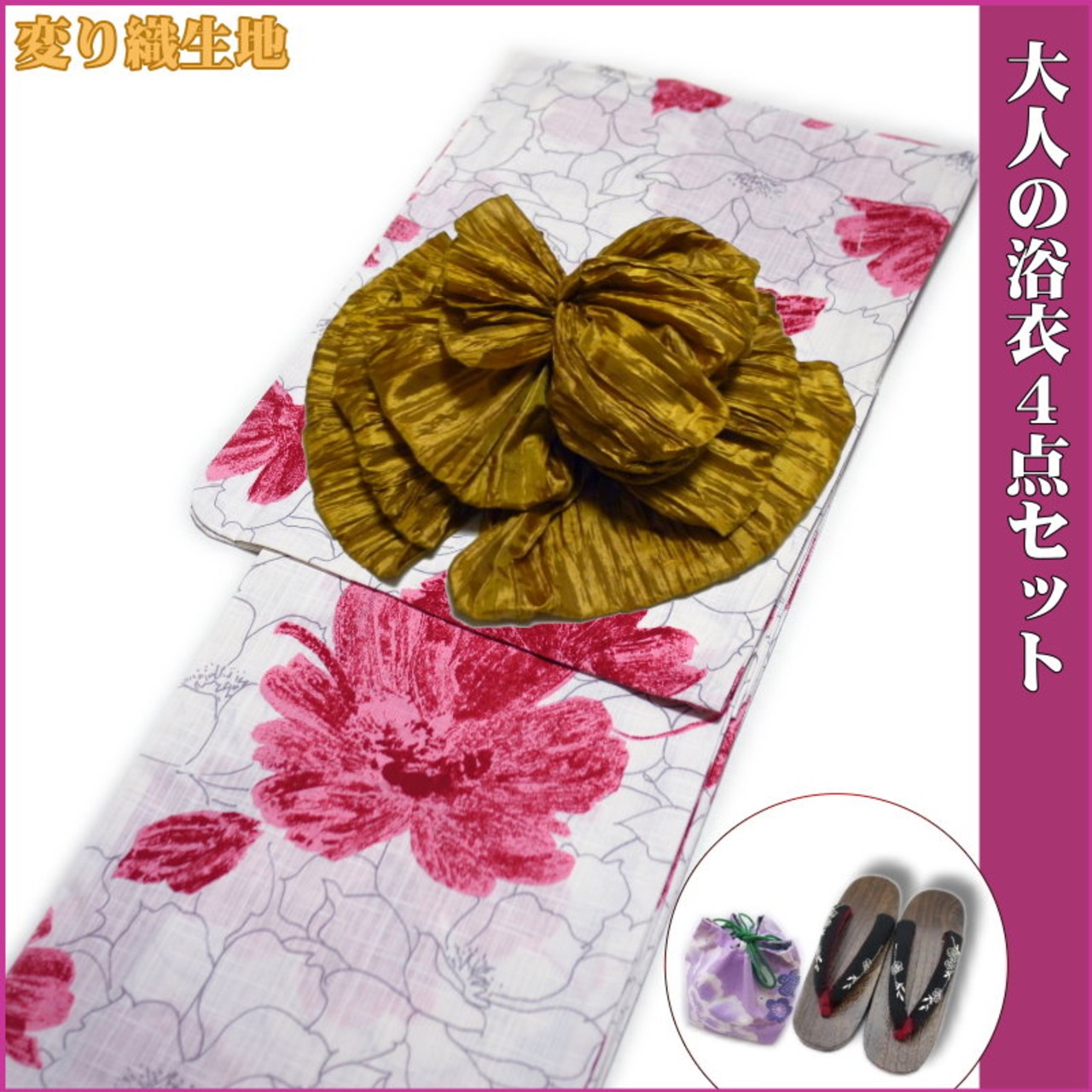 素敵な浴衣・帯・下駄・巾着の4点セット。