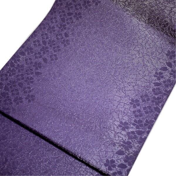 パープル系からシルバーグレーへのグラデーションに桜の地模様が全体に入っています。前柄は3番目の画像となります。裏側はくすんだ紫色の無地。5番目の画像は結んだ時のイメージです。(帯・帯揚げはサンプルで含まれません。)