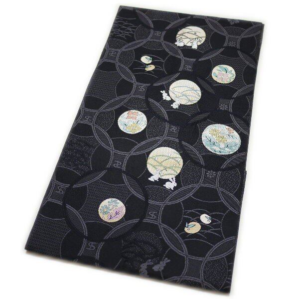 【色 柄】黒地にグレーで丸紋が全体に、色々な色でウサギや花柄等の色々な柄が織り出されています。