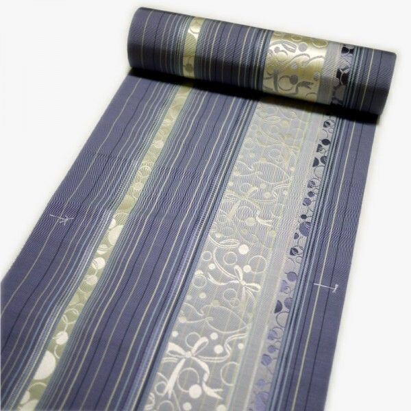 【色 柄】全体は青紫色地にグレー系の部分にアイボリー色で可愛らしいリボンや輪がが描かれたとても素敵な珍しい柄の帯です。