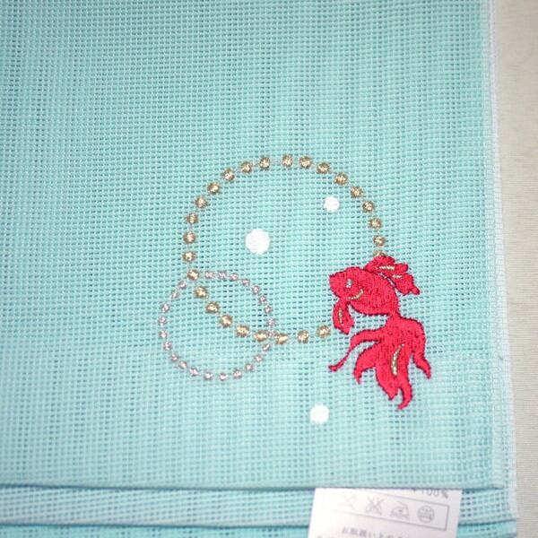 表:ブルー色地に可愛らしい金魚と、金銀の泡の刺繍が片側の端にのみあるポイント柄。
