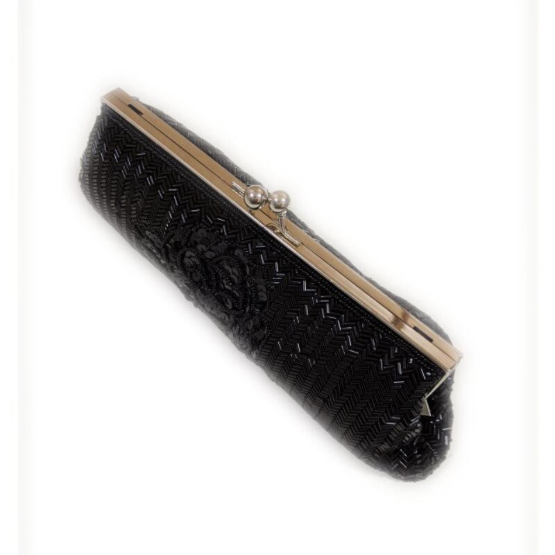 光沢のある黒のサテン生地に黒のビーズやスパンコールで薔薇の花が描かれた素敵なバッグです。