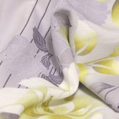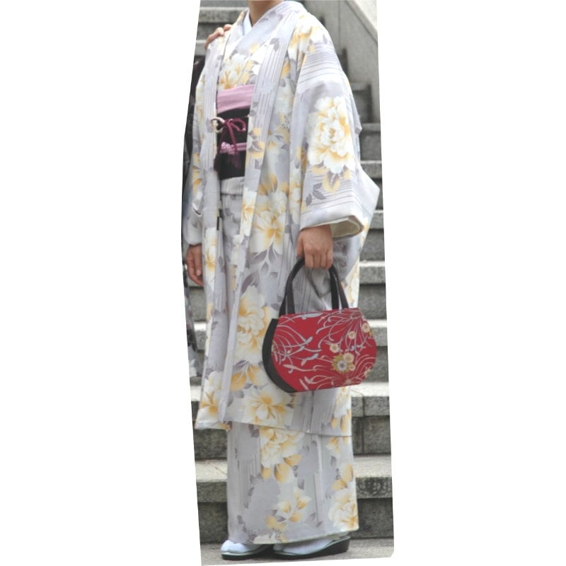【色 柄】淡いパープルグレー色地に黄色のぼかしの牡丹柄。縦縞も入っているのですらっとして見えます。