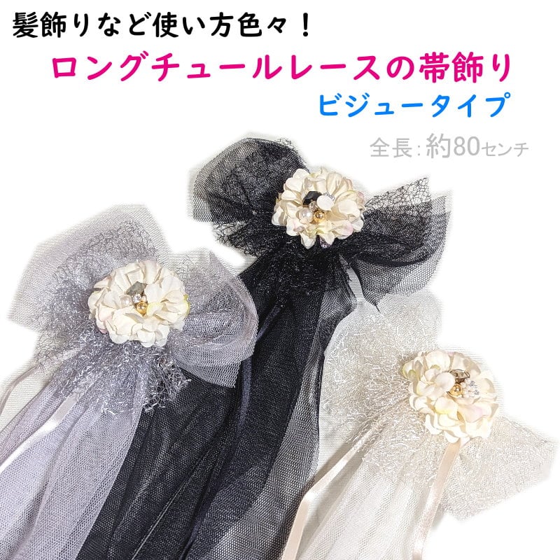 帯飾り 髪飾り ロングチュールレース(ビジュータイプ:3色)浴衣 袴 振袖 夏祭り 花火大会 卒業式 成人式 リボン [a-335]